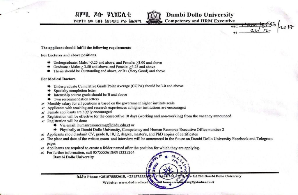 - Physically: Visit the Dambi Dollo University, Competency and Human Resource Executive Office, number 2.