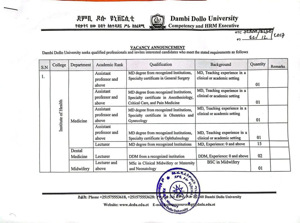 Are you a passionate and qualified professional looking to make a difference in academia? Dambi Dollo University, located in the vibrant town of Dambi Dollo in Oromia, Ethiopia, is expanding its esteemed faculty and invites highly motivated individuals to apply for various academic positions. We are committed to fostering a dynamic learning environment and are looking for dedicated educators and researchers to join us.