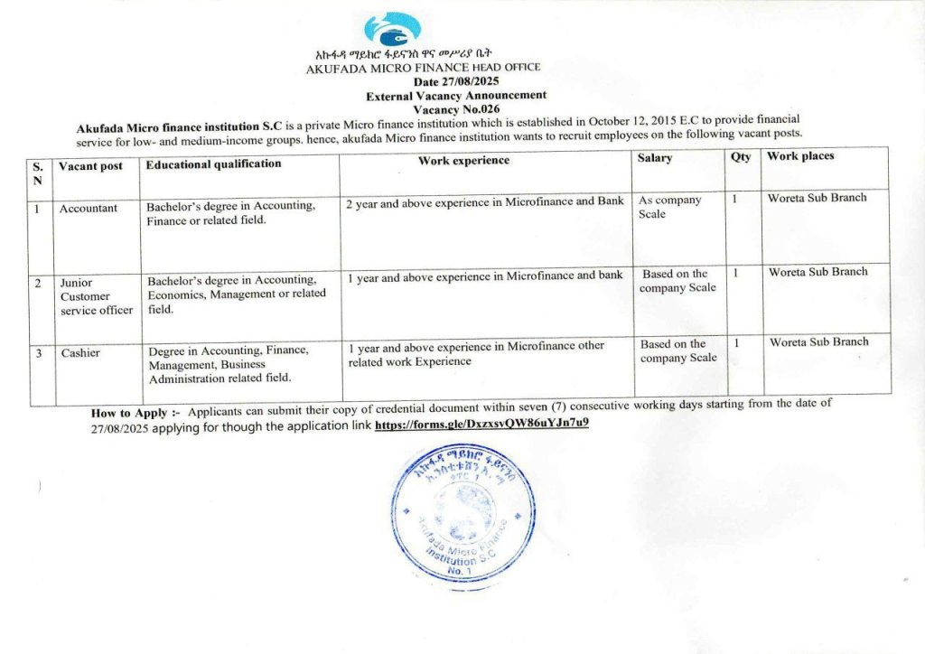 Akufada Micro Finance Institution S.C. is a private institution that provides financial services to low and medium-income groups. We are seeking to fill three vacant positions at our Woreta Sub Branch with qualified and dedicated professionals.