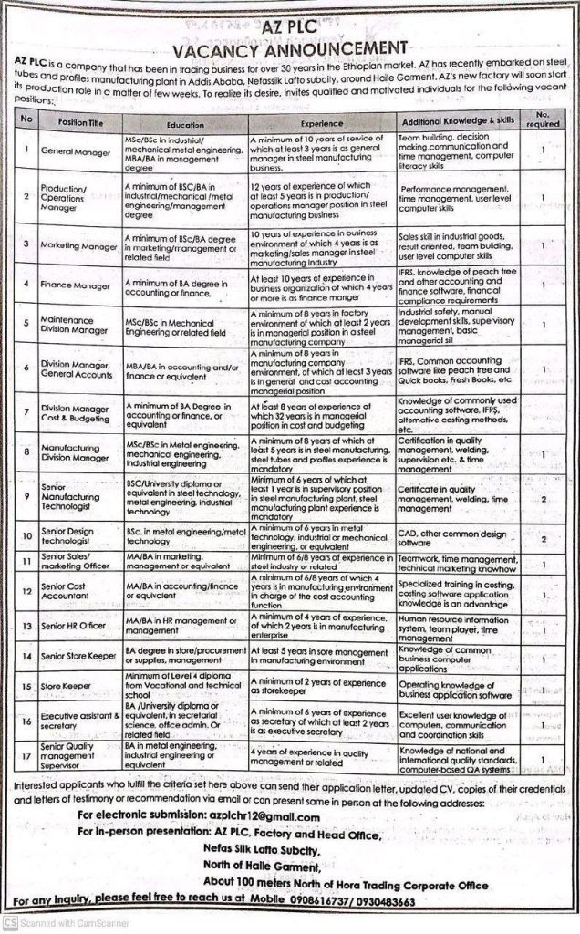 AZ PLC is a company with a strong history in trading and business management. Following a recent expansion into steel tubes and metal manufacturing, the company is opening a new factory in Adaba, Bale. We are looking for experienced and motivated individuals to join our team in a variety of permanent roles.