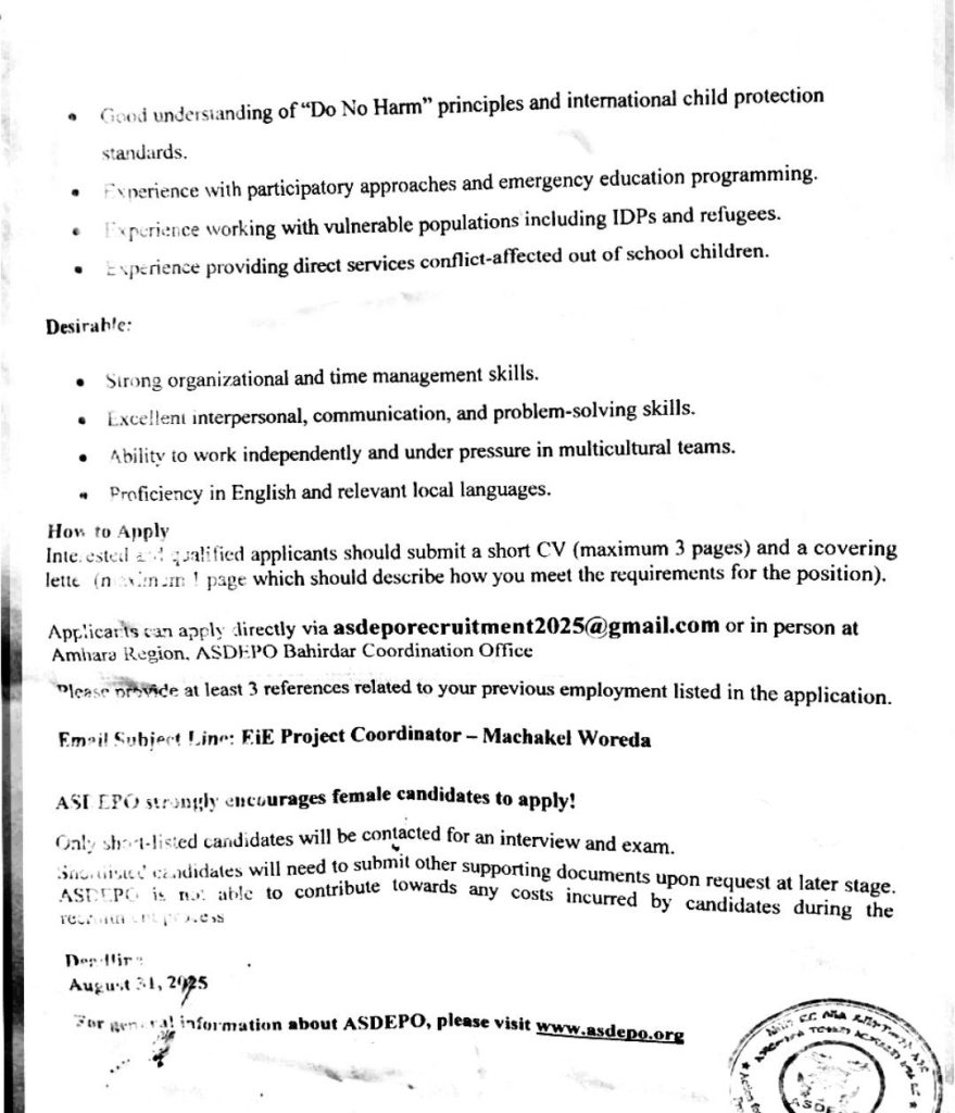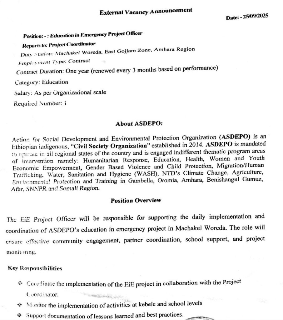 Action for Social Development & Environmental Protection Organization (ASDEPO) is a non-profit, non-governmental humanitarian organization dedicated to providing multi-sectoral emergency assistance and development interventions. ASDEPO is currently seeking a qualified professional for the position of Education in Emergency Project Officer for its program in the East Gojjam Zone, Amhara region.