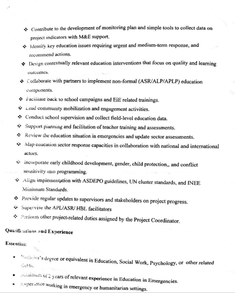 • Desired Skills: The ideal candidate will have knowledge of formal and non-formal education, familiarity with humanitarian interventions in Internally Displaced Persons (IDP) settings, and an awareness of safeguarding and child protection issues.