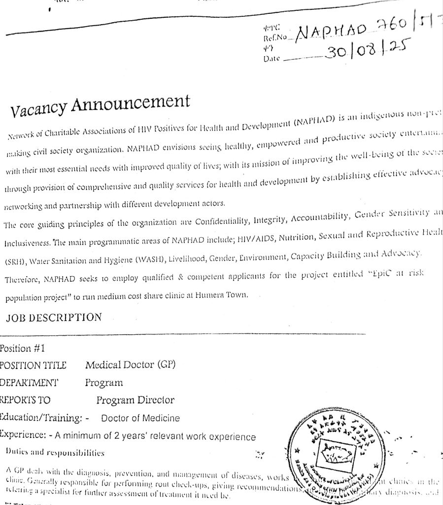 NAPHAD (Network of Charitable Associations of HIV Positive for Health and Development) is a non-governmental organization working to improve the well-being of people with HIV. The organization is seeking qualified and competent applicants for the “Epic at risk population project” to run a medium-cost share clinic in Humera Town.