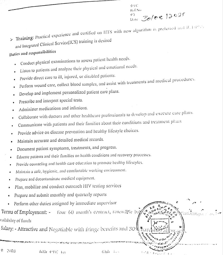 The Nurse will work under the supervision of a Medical Doctor to provide patient care and support health programs.