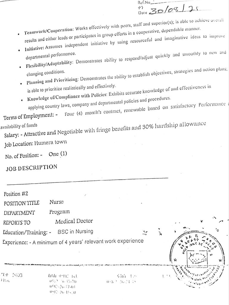 - Salary: The salary is attractive and negotiable with fringe benefits and a 30% hardship allowance.