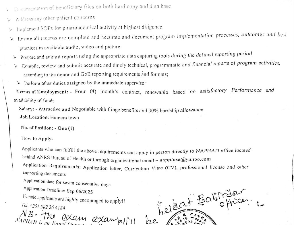 - How to Apply: Applicants can apply in person at the NAPHAD office behind the ANRS Bureau of Health or via email to
