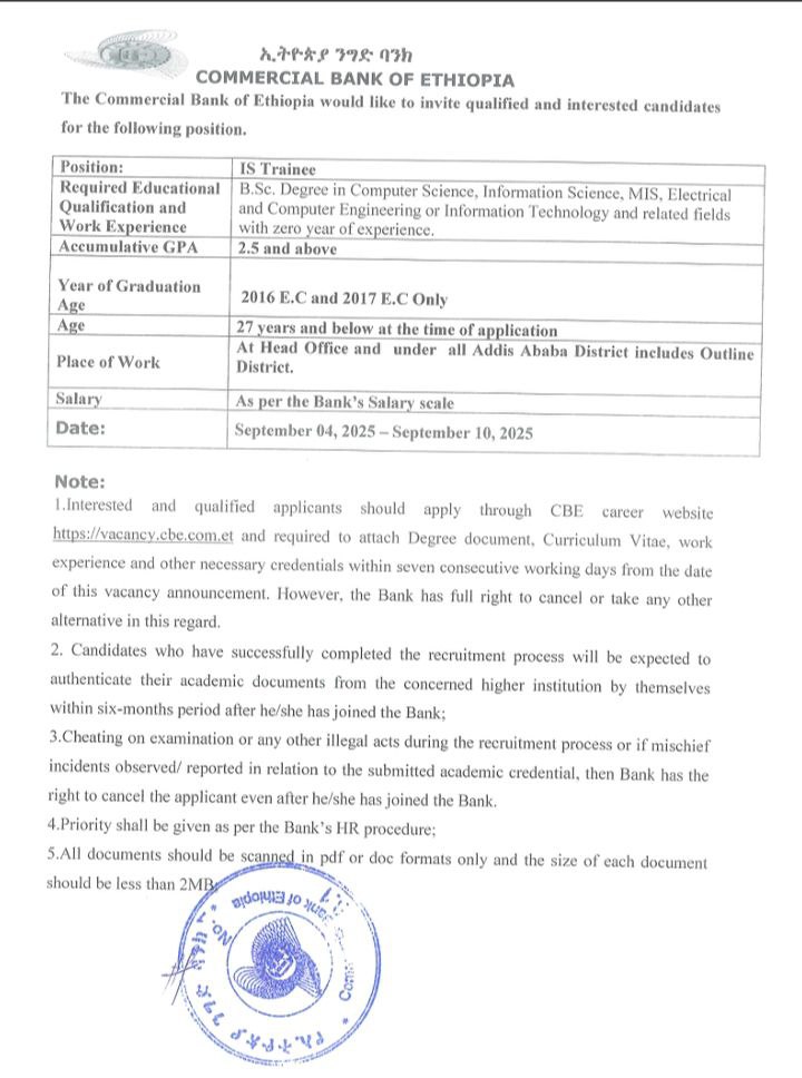 Commercial Bank of Ethiopia (CBE) is seeking qualified and interested candidates for an IS Trainee position. This is an entry-level opportunity for recent graduates to join the bank’s team and begin a career in information systems.