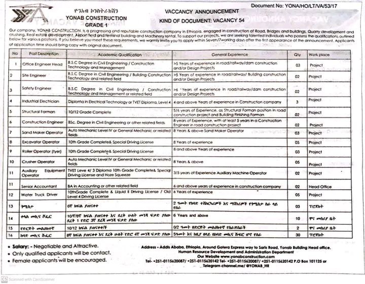 ​Yonab Construction, a reputable construction company in Ethiopia, is currently seeking qualified professionals for various project-based and permanent positions. The company is engaged in road, bridge, and building construction, as well as quarry development and real estate.
