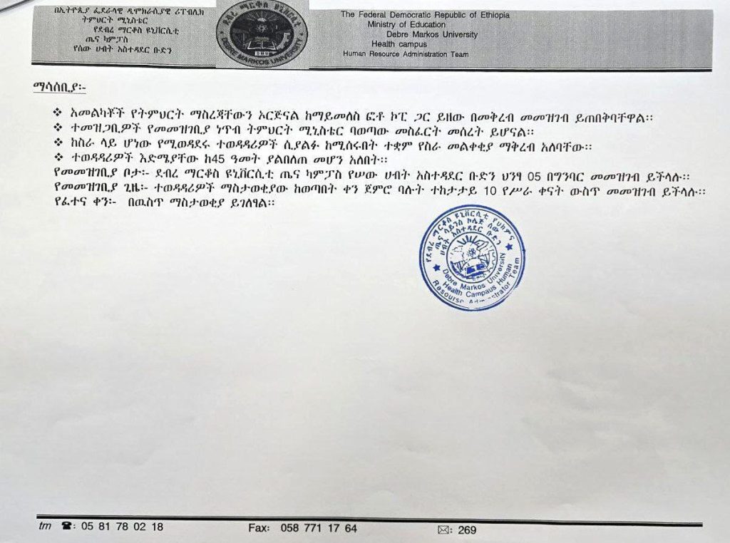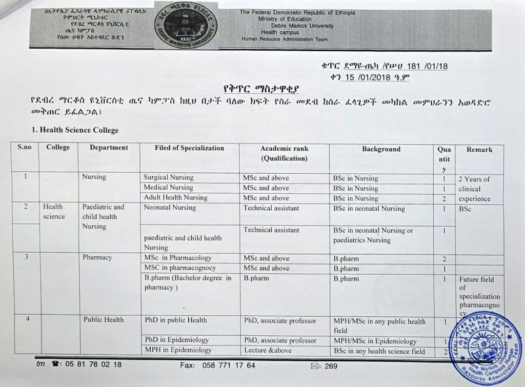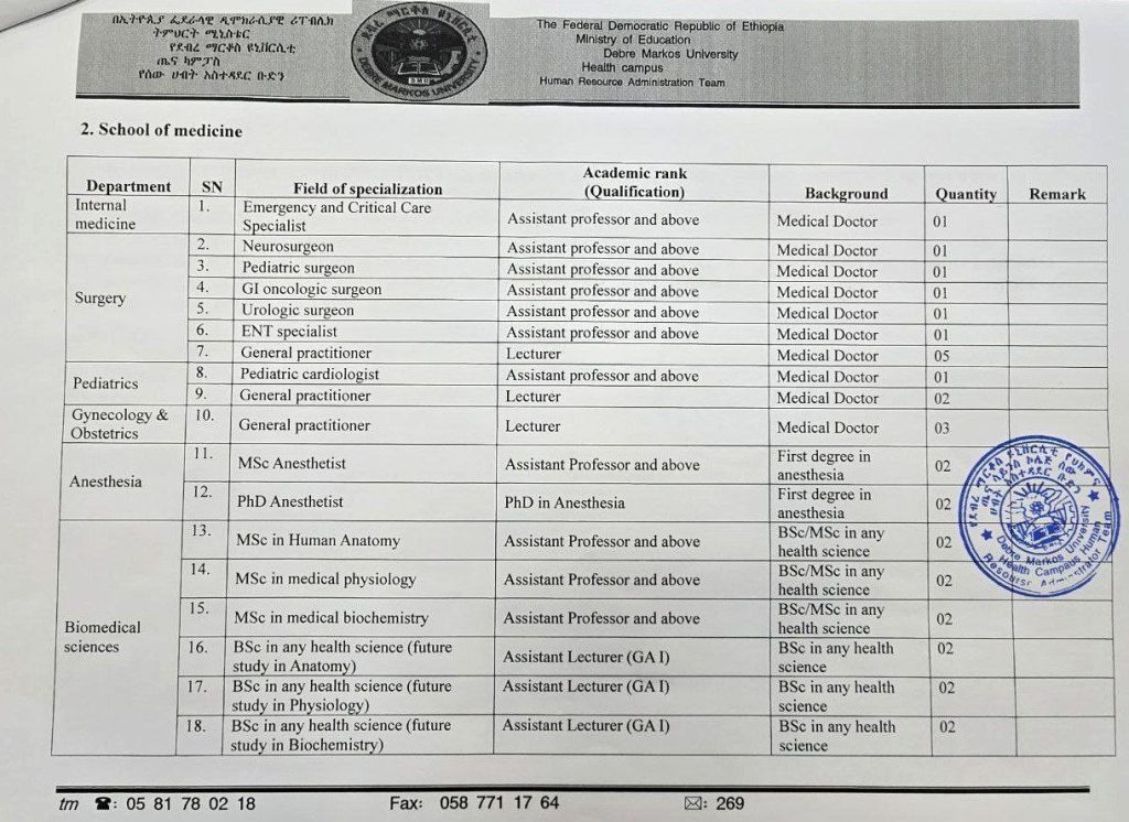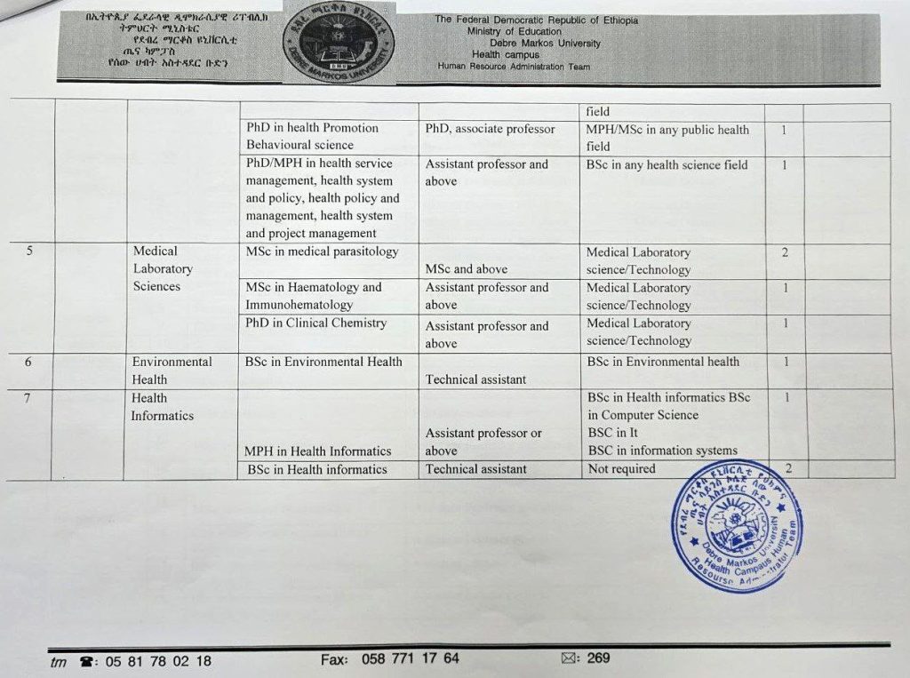 Debre Markos University Health Campus is undertaking a major recruitment drive for qualified Academic Staff (Teachers) to join the Health Science College and the School of Medicine. The University is seeking highly competent professionals across 27 distinct specializations to fill a total of 57 positions. Successful candidates will contribute to teaching, research, and community service, supporting the University’s mission in health education.