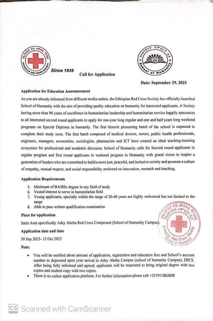 The Ethiopian Red Cross Society (ERCS), leveraging over 90 years of leadership in humanitarian service, is inviting applications for the second round of its Special Diploma in Humanity program through the newly established School of Humanity. This program aims to cultivate a generation of leaders committed to social responsibility, empathy, and building a more peaceful and just society through innovation, research, and teaching.