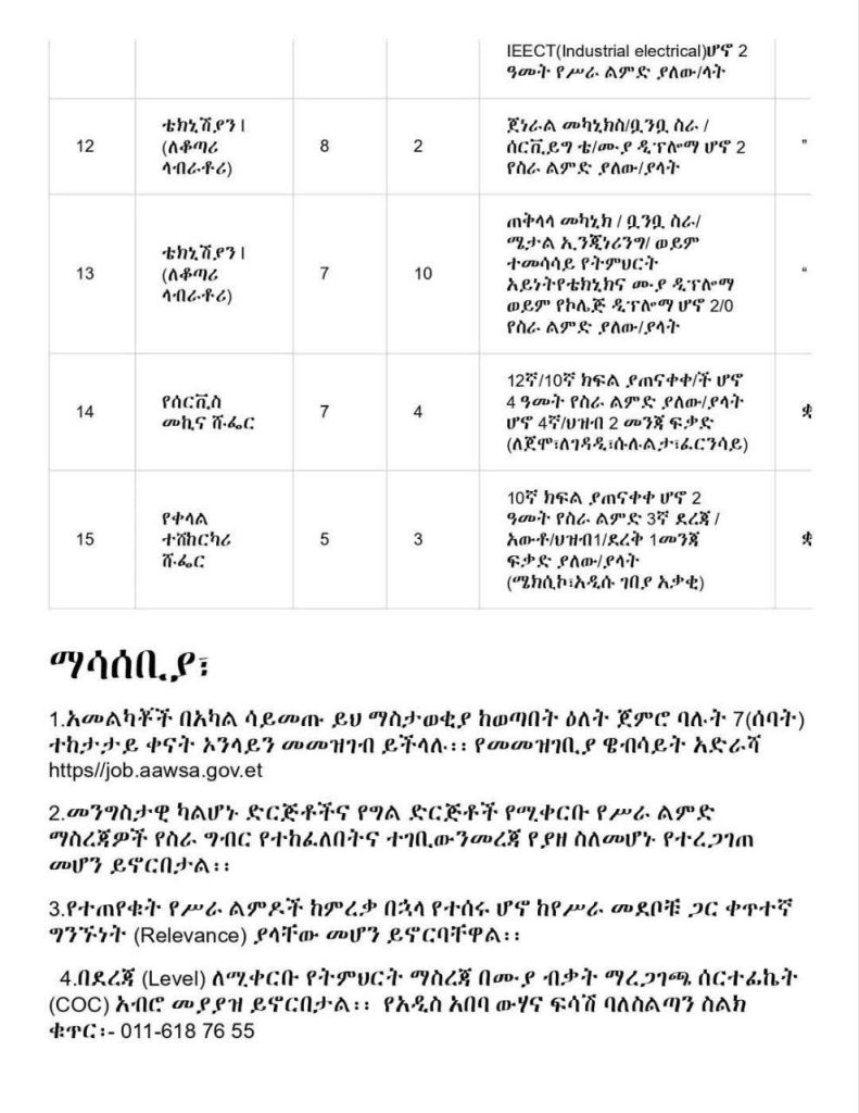 Organization: Addis Ababa City Administration Water & Sewerage Authority (AAWSA) Total Positions Available: 14 distinct roles