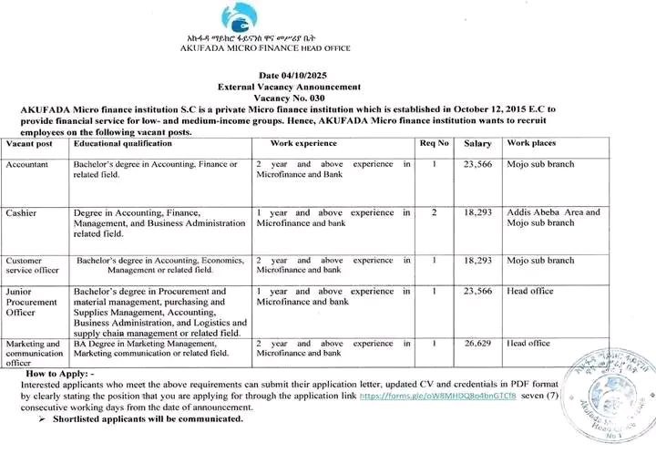 Akufada Microfinance S.C. is seeking competent professionals to fill various roles across its newly opening branches, sub-branches, and Head Office. The institution is looking to recruit qualified individuals with experience in the microfinance and banking sector.