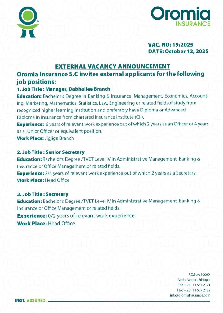 Oromia Insurance S.C invites external applicants for the following job positions: