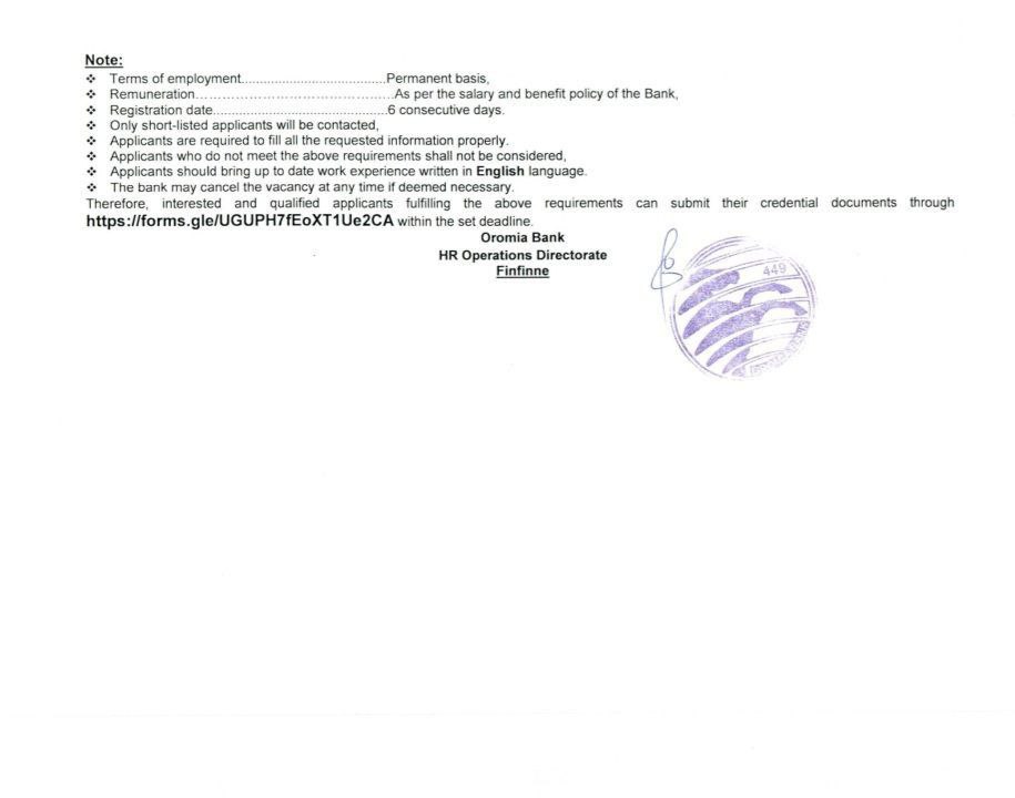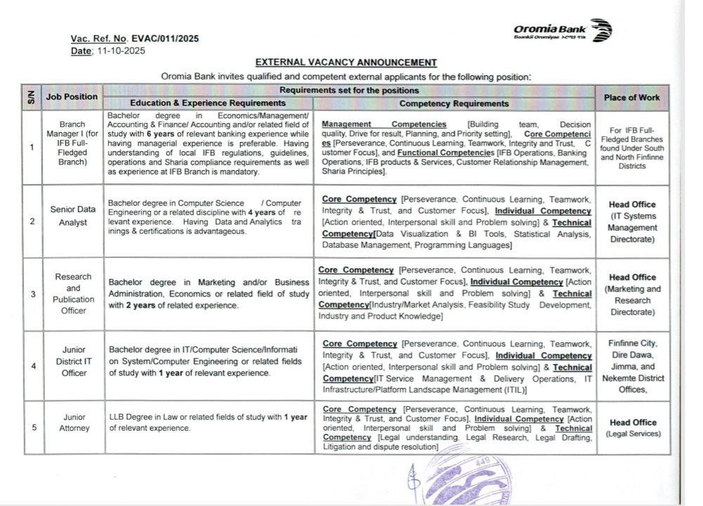 Oromia Bank, through its HR Operations Directorate in Finfinne, is inviting qualified and interested external candidates to apply for five permanent positions across its various branches and head offices.