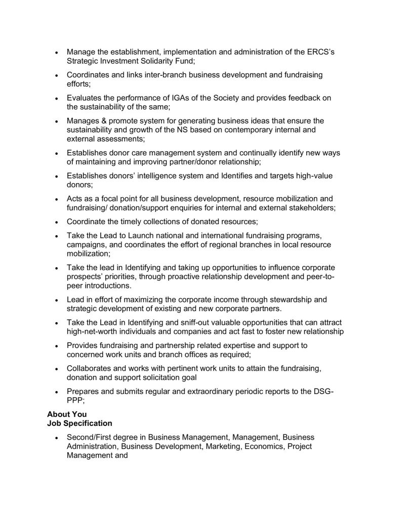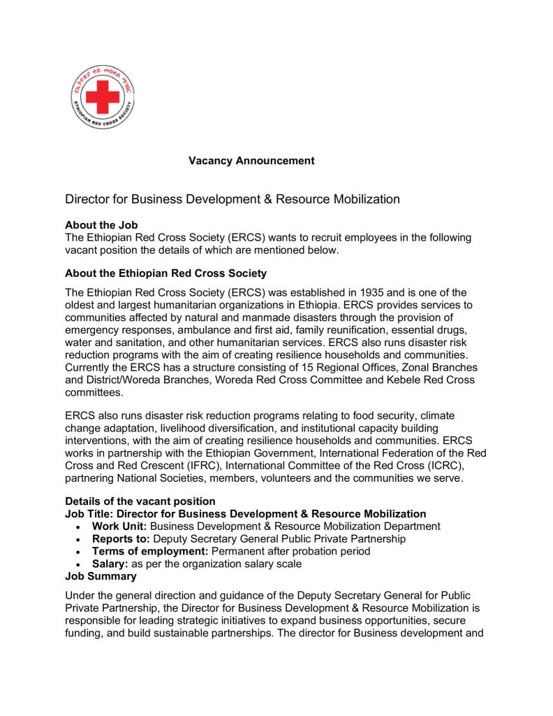 The Ethiopian Red Cross Society (ERCS), one of Ethiopia’s largest and oldest humanitarian organizations, is seeking a qualified individual for the senior role of Director for Business Development & Resource Mobilization.