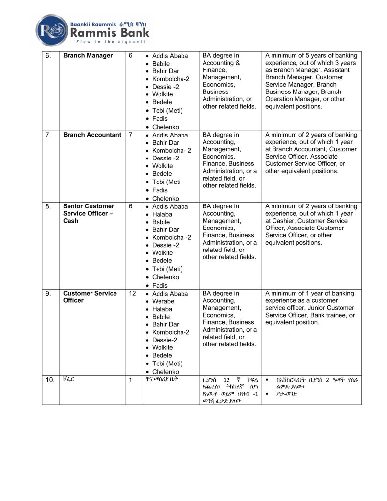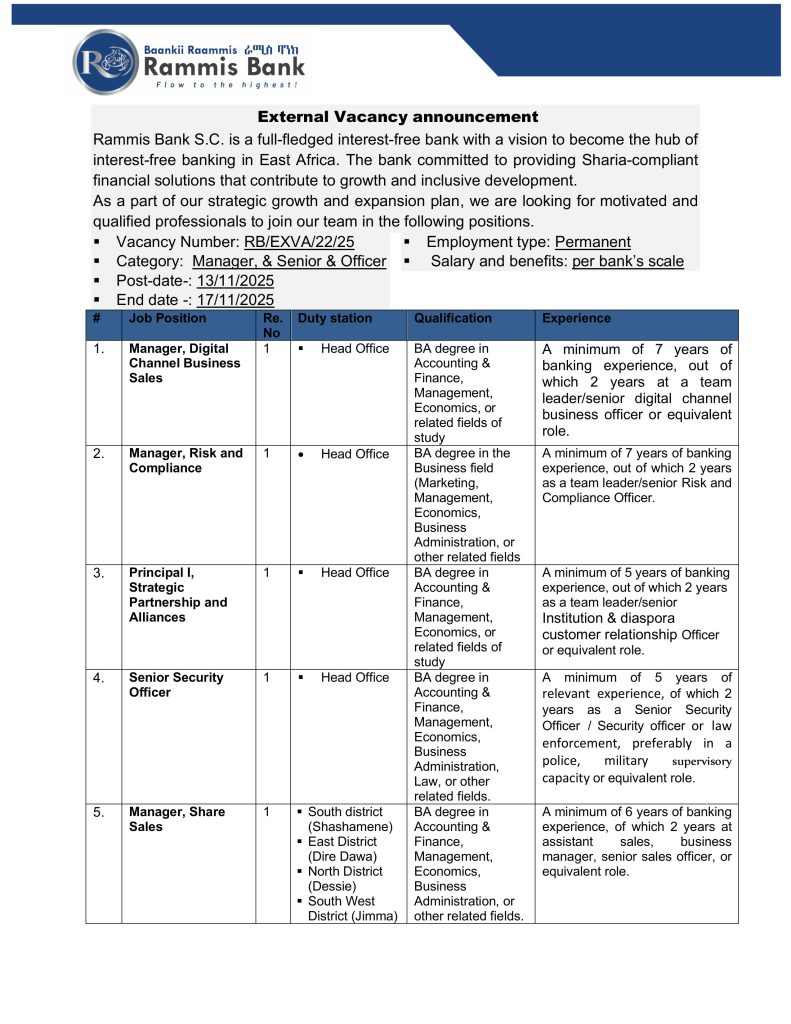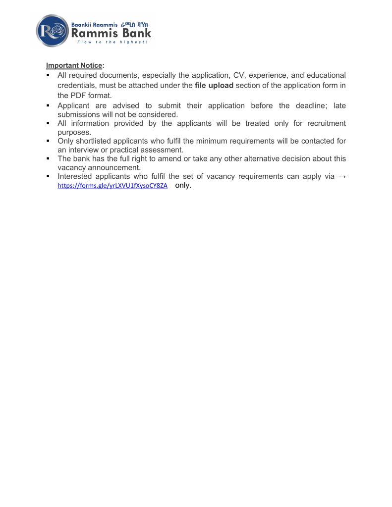 In line with strategic growth and expansion plans, Rammis Bank is seeking qualified professionals for the following positions: