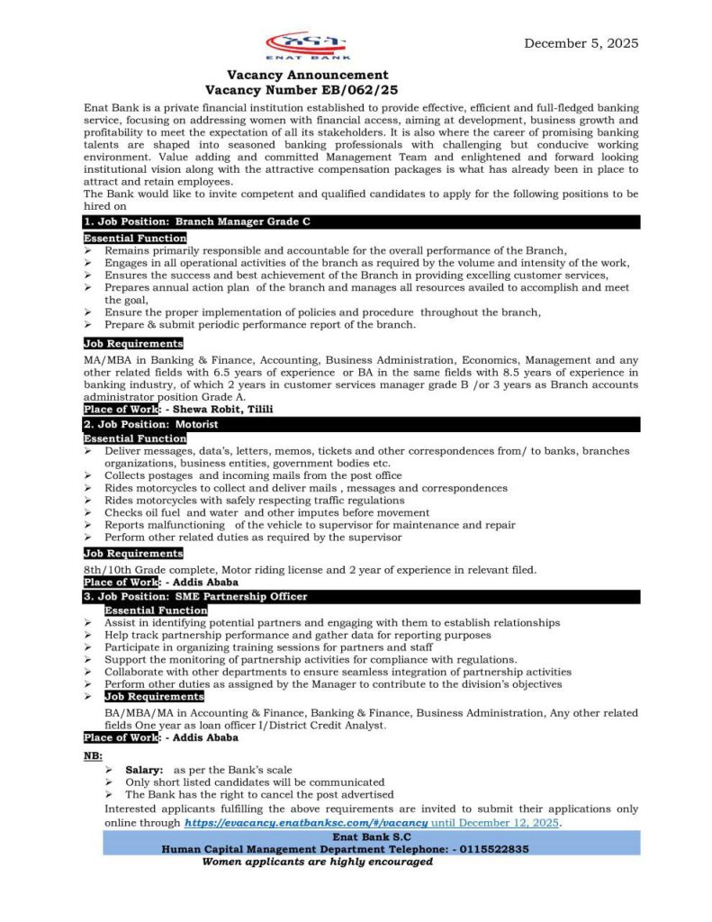 🏦 Enat Bank S.C. Vacancies