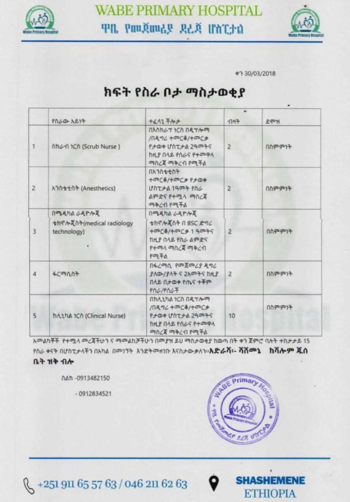 Wabe Primary Hospital is currently advertising open positions for experienced healthcare professionals to join its team. The hospital serves the community of Shashemene, Ethiopia, providing essential medical services. The following positions require proven experience in a hospital setting and specific educational qualifications.