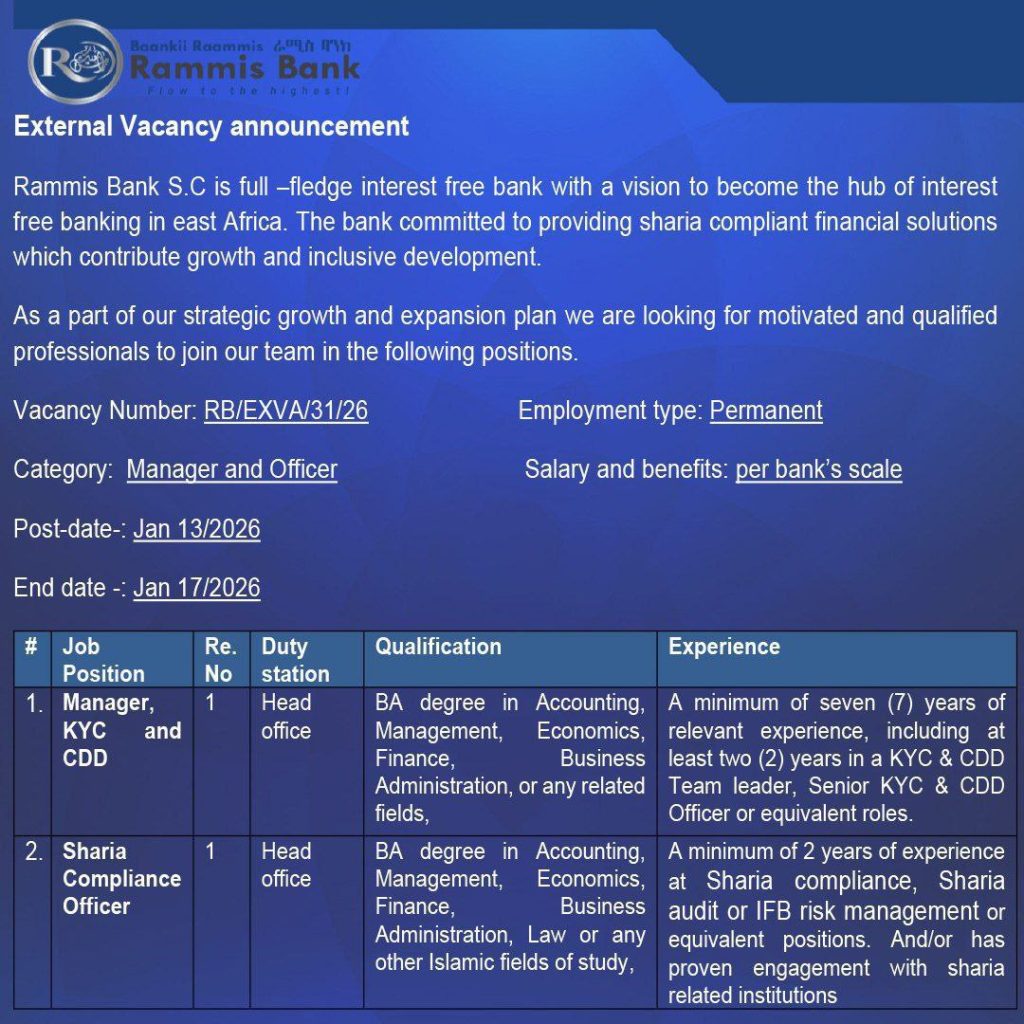 Rammis Bank S.C is a full-fledged interest-free bank aiming to become the hub of Islamic banking in East Africa. The Bank provides sharia-compliant financial solutions that promote inclusive economic development. As part of its strategic expansion, Rammis Bank seeks qualified professionals to join its team in the following positions.